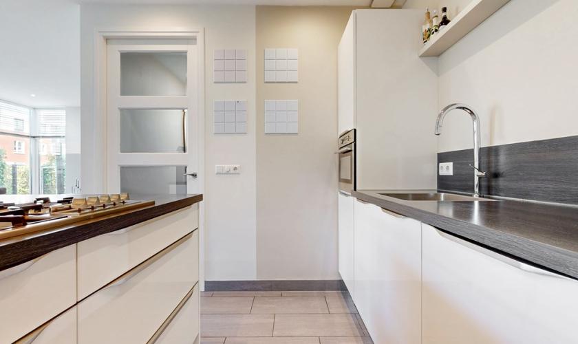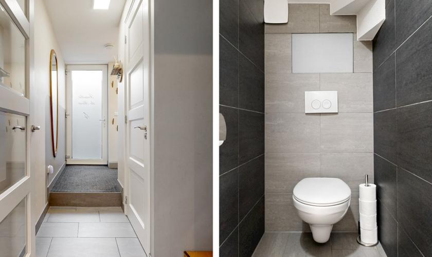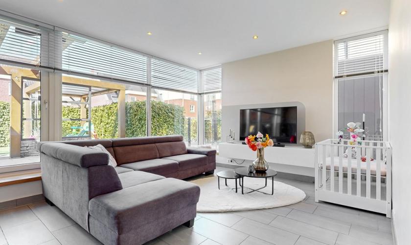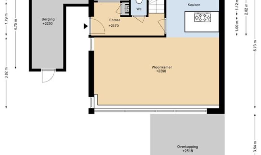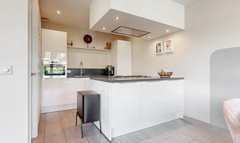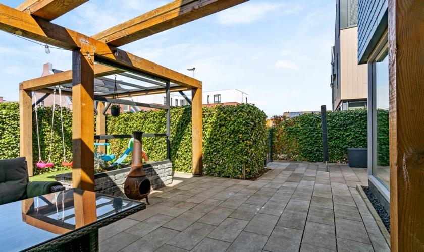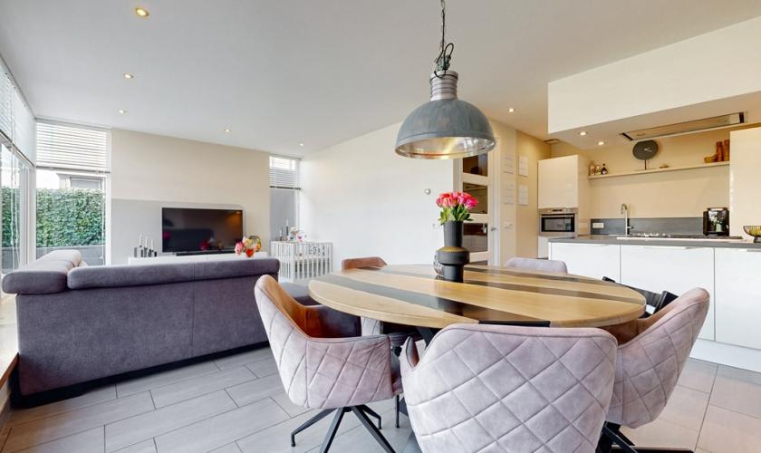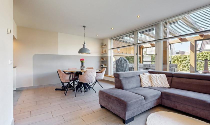 Bij binnenkomst treft u een nette entree met toegang tot het toilet en de meterkast. Vanuit hier loopt u door naar de ruime en lichte woonkamer, die naadloos overgaat in de moderne keuken. De woonkamer vormt het centrale leefgedeelte en biedt via een schuifdeur toegang tot de overkapping in de tuin – een heerlijke plek om al vroeg in het seizoen van het buitenleven te genieten.