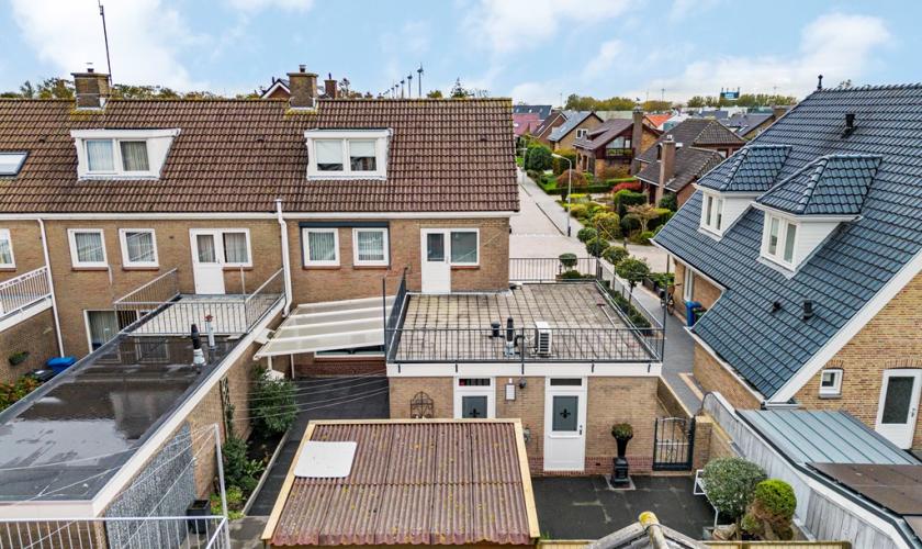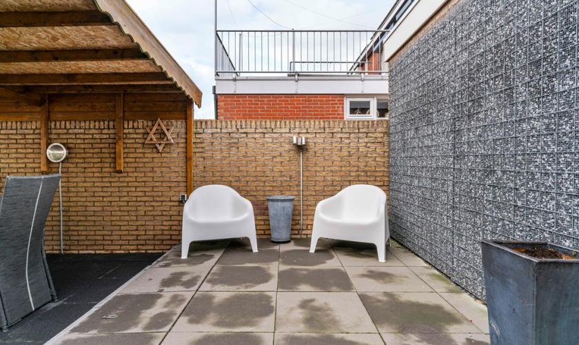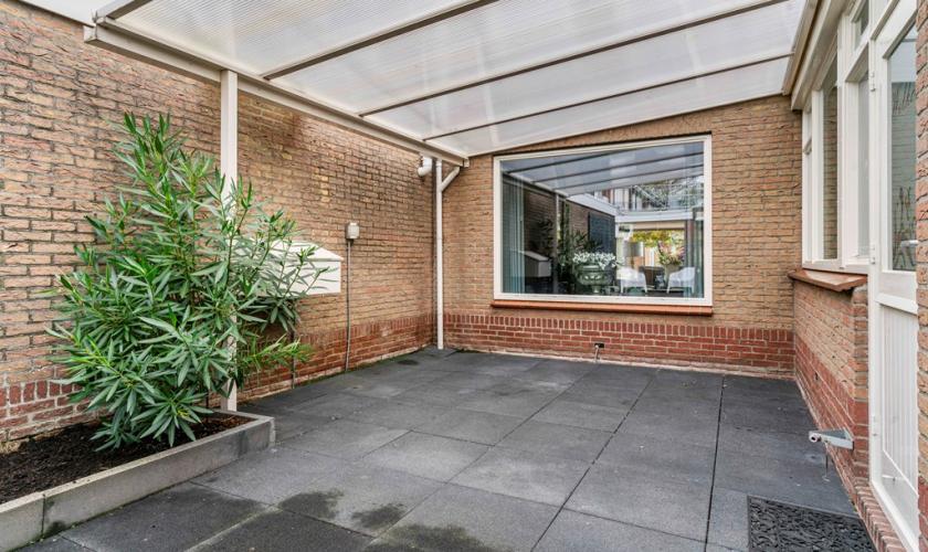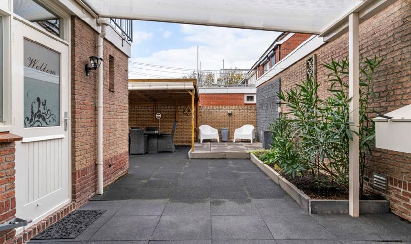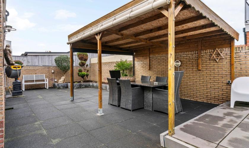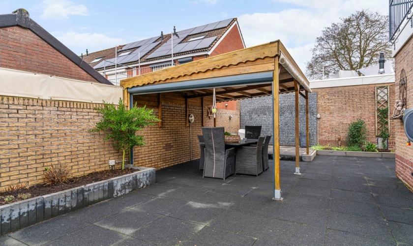 De tuin op het noordwesten is fraai aangelegd en beschikt over een gezellige overkapping, waar je tot laat op de avond heerlijk kunt zitten. Dankzij de hoekligging geniet je bovendien van extra privacy en zon op de juiste momenten van de dag.