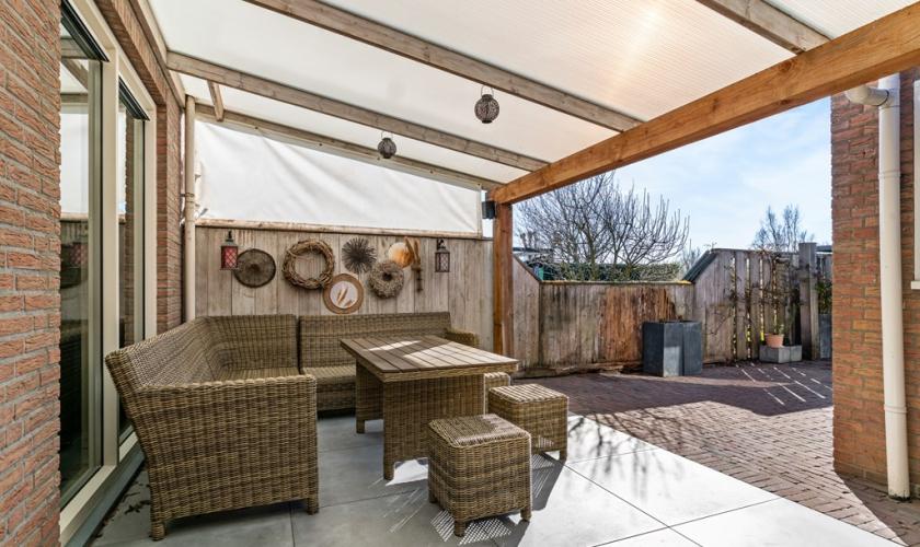 De achtertuin is gunstig gelegen op het zuiden, waardoor u hier de hele dag kunt genieten van de zon, privacy en het vrije uitzicht. De ligging aan de witte zandvlakte, gecombineerd met een waterpartij, maakt deze plek extra bijzonder en biedt elk seizoen een fraai en levendig uitzicht.