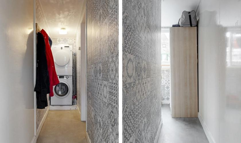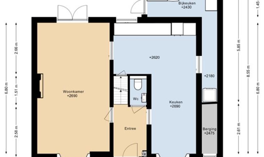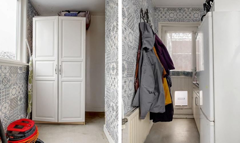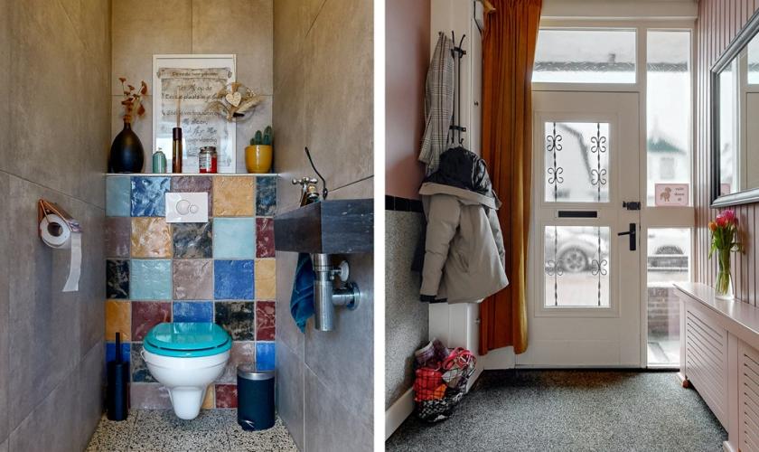 Entree met hal en toilet en trapopgang. Aan de ene zijde de ruime woonkamer en aan de andere zijde een woonkeuken.