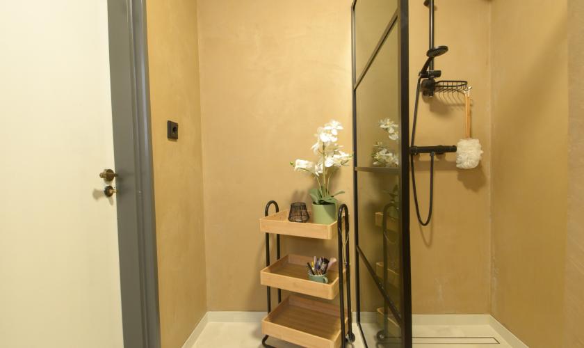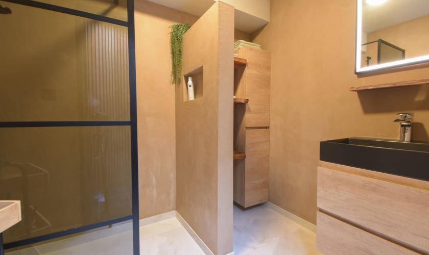 De badkamer bevindt zich op de begane grond en is in 2024 geheel vernieuwd met een inloopdouche, wastafelmeubel en met betonciré afgewerkte wanden.