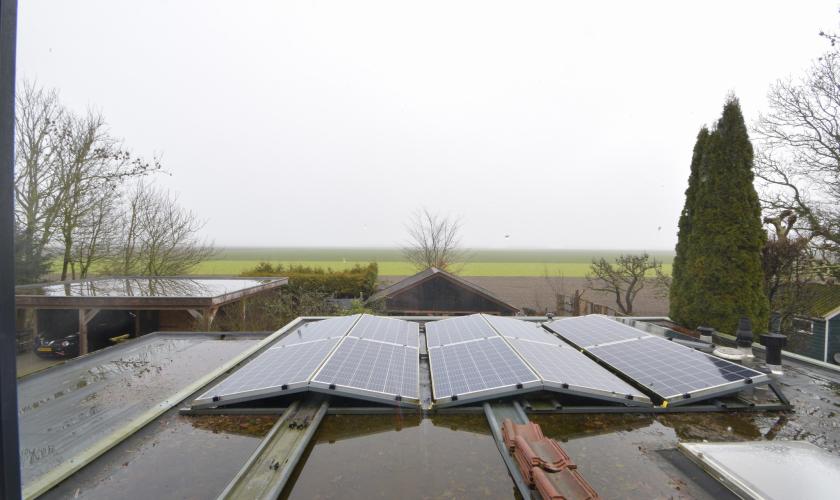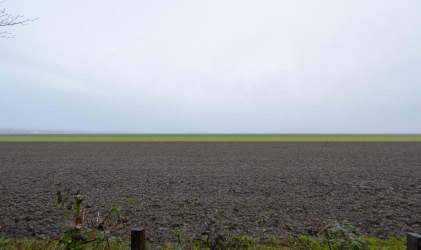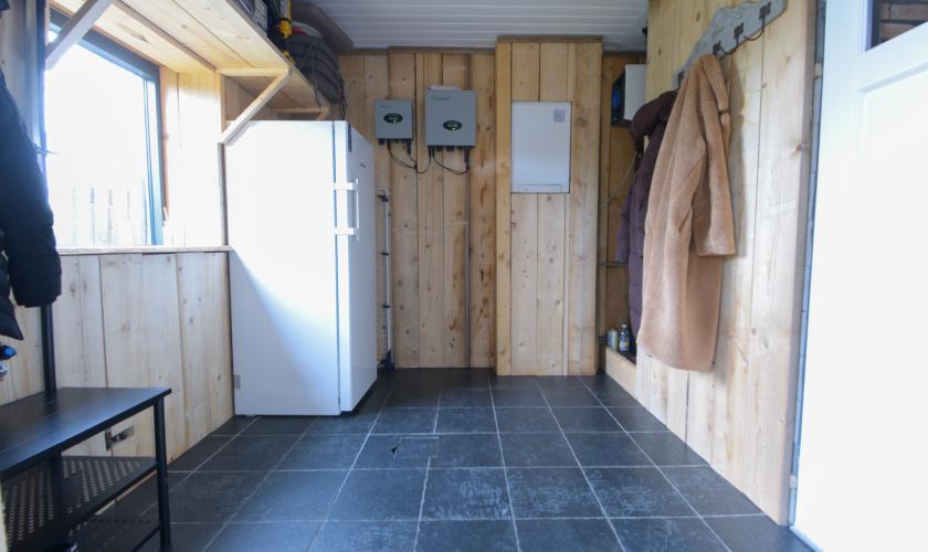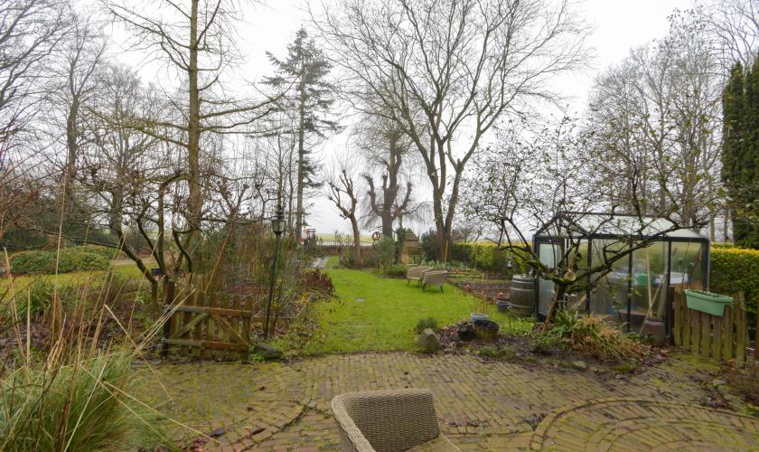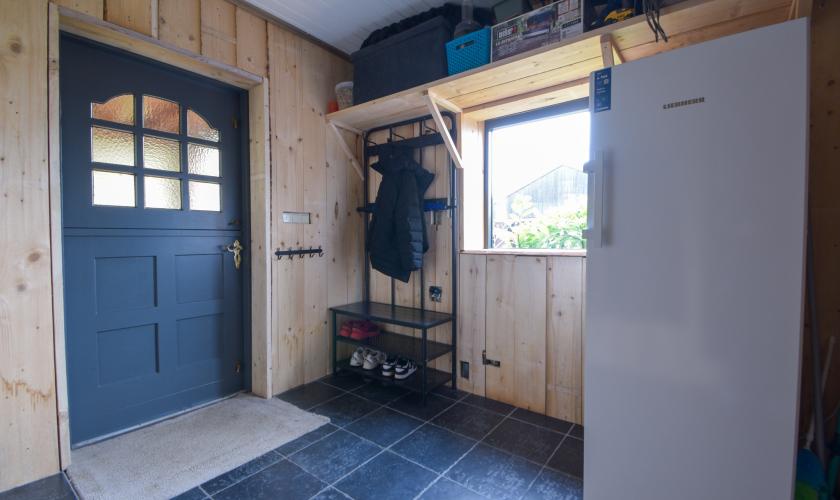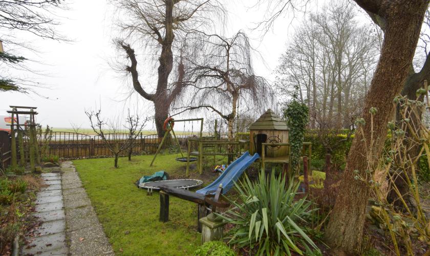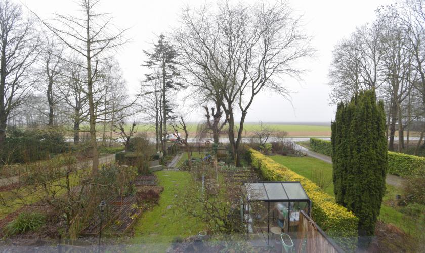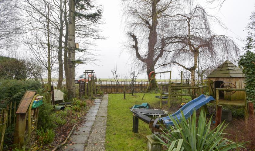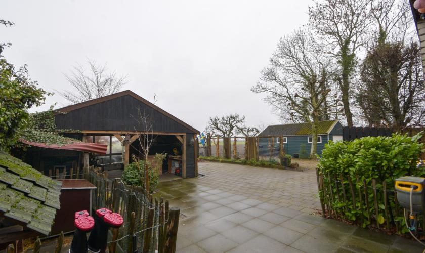 Aan de achterzijde (te bereiken per auto over het overpad van de buurvrouw) bevindt zich een forse en multifunctionele overkapping als schuur/berging en vanaf daar is er ver uitzicht over de velden.