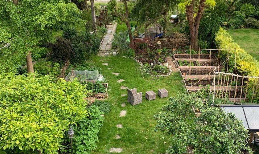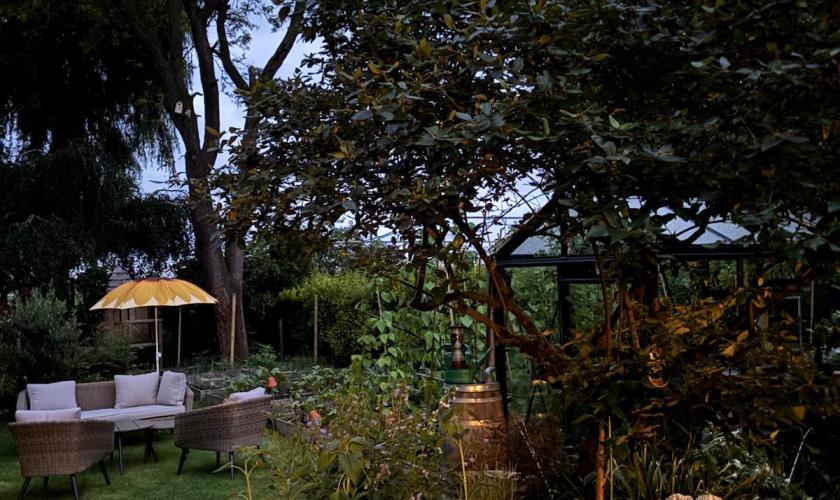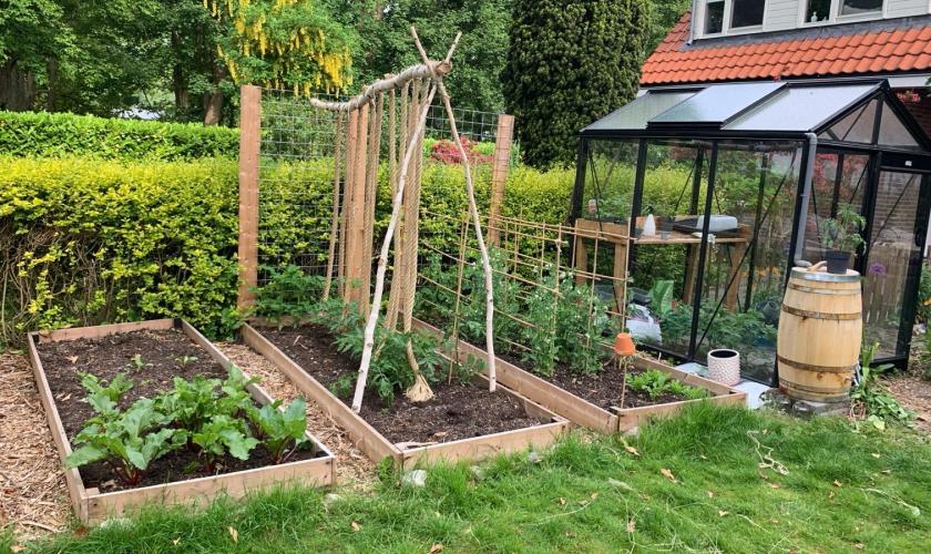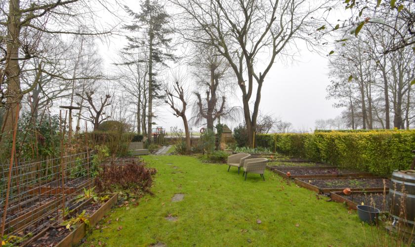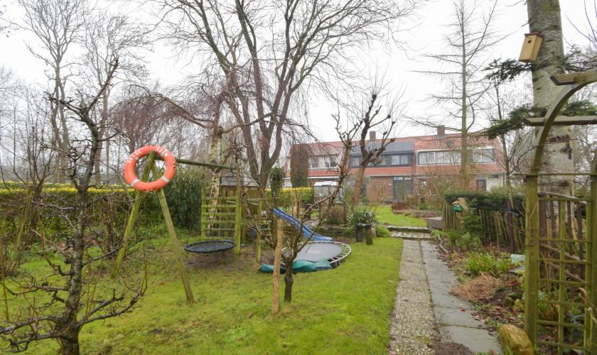 De voortuin is heerlijk diep, ligt op het zonnige zuiden en biedt vele mogelijkheden. Hier staan nu 4 appelbomen, twee perenbomen (stoof en hand) een aalbesstruik en een olijfboom. Ook staat hier een prachtige broeikas van het merk ACD, een multifunctioneel kinderspeeltoestel en een ingegraven trampoline.