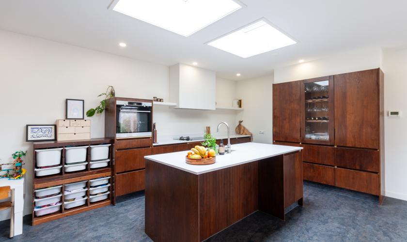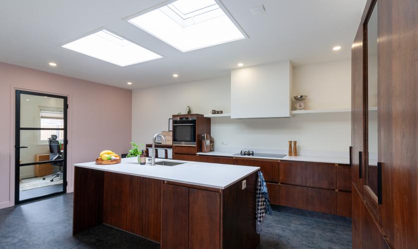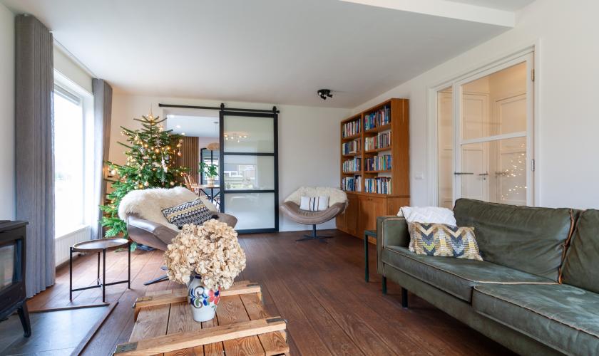 Van oorsprong zijn deze woningen niet groot opgezet maar door de zéér royale aanbouw aan de achterzijde van bijna 10 meter over de gehele breedte is er een héél groot woonoppervlak ontstaan op de begane grond. Die aanbouw is recent gerealiseerd (2021) en toen is ook vrijwel de hele begane grond opnieuw ingedeeld en ingericht. Wat voorheen kamer met keuken was is nu geheel een straatgerichte woonkamer geworden met daarachter een heerlijk ruime en brede woonkeuken met het aanrecht in modulaire opstelling voorzien van alle gewenste inbouwapparatuur.