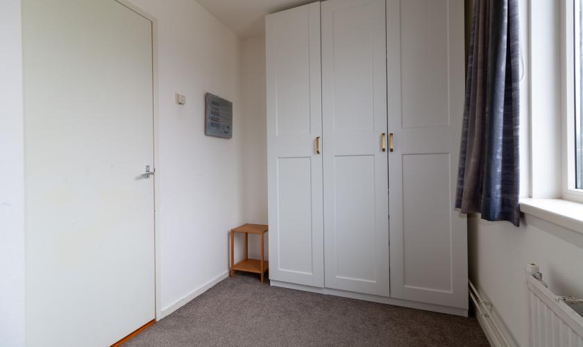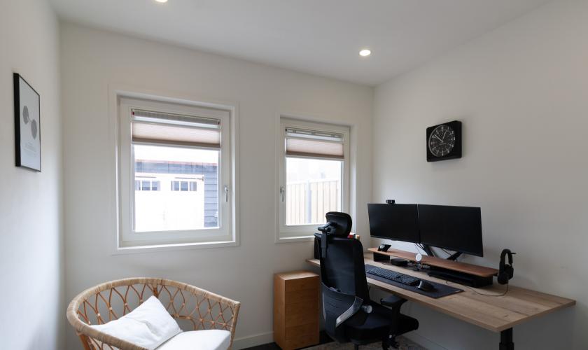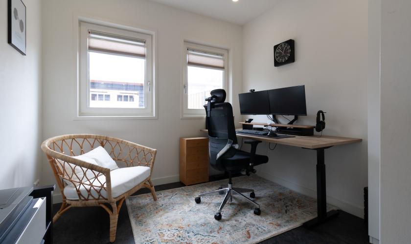 Achter deze riante en lichte leefkeuken nog een ruim kantoor/studeer/speel/slaapkamer en een eveneens royale bijkeuken voorzien van het toilet en een fraaie driedeurskastenwand met daarin technische apparatuur en de aansluitingen voor wasmachine en droger.