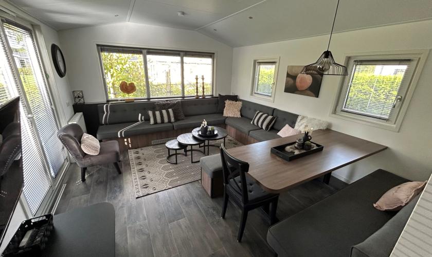 Woonkamer: Open living met veel lichtinval, tuindeuren naar terras, 50-inch tv, dimbare verlichting en vaste eethoek met opbergruimte.