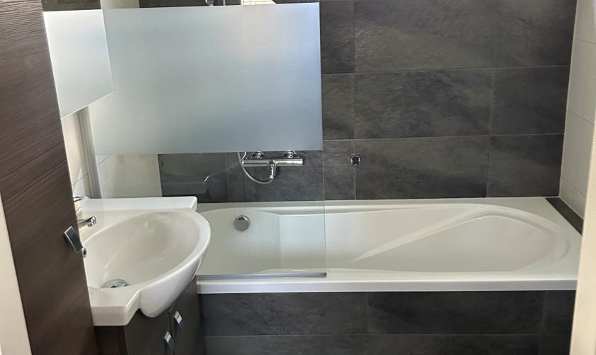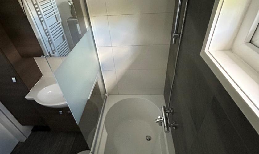 Badkamer: Bad met thermostaatkraan en douchegedeelte, badmeubel, designradiator, vrijhangend toilet en ventilatiesysteem.