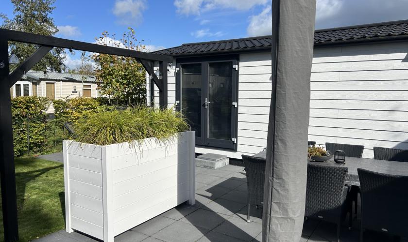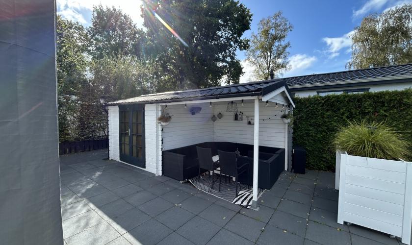 - Tuinhuis met bergruimte, overkapping, loungehoek en terrasverwarmer