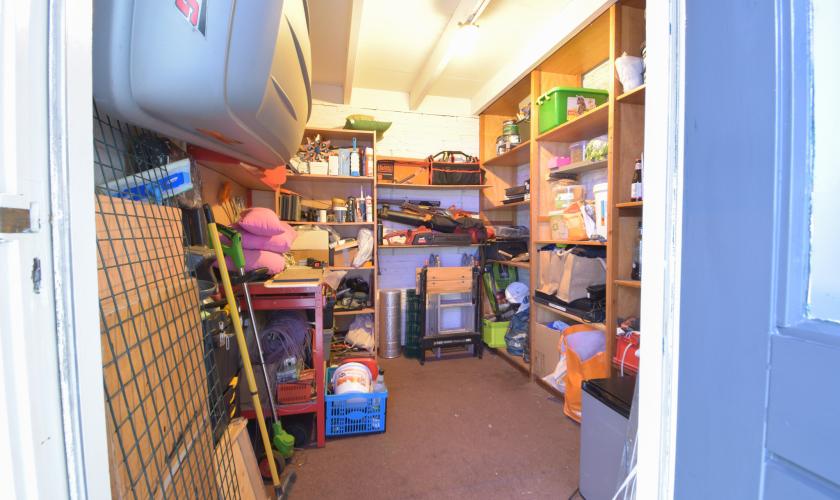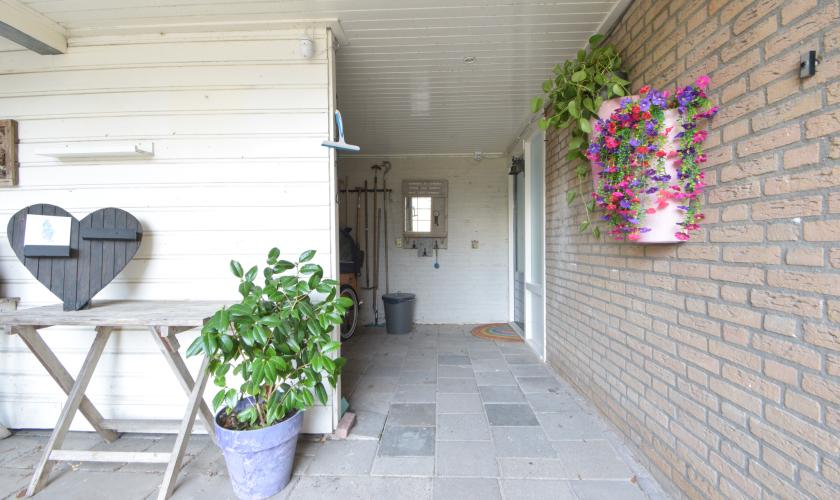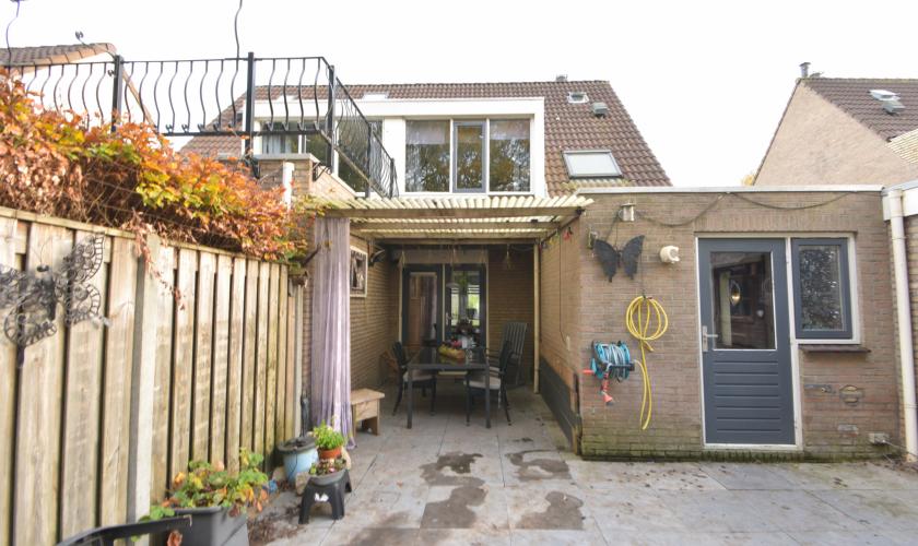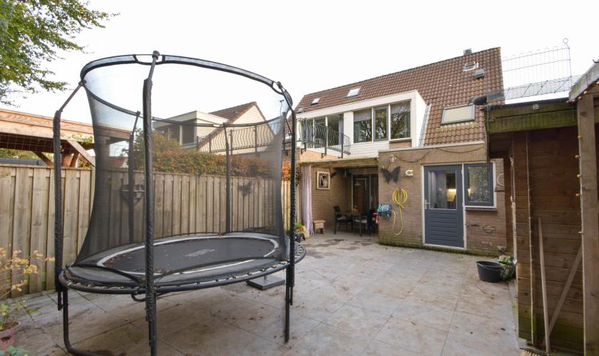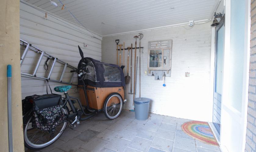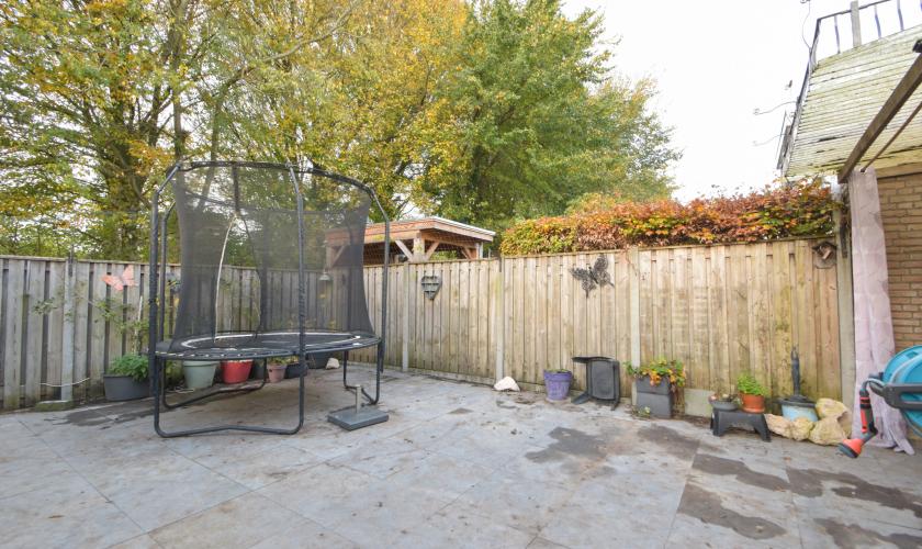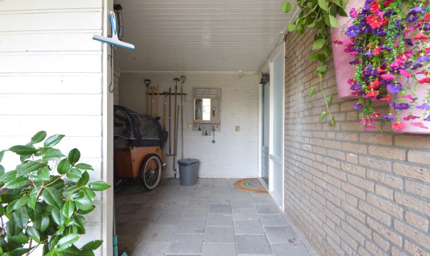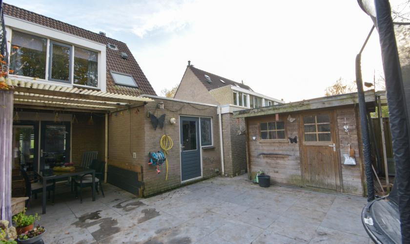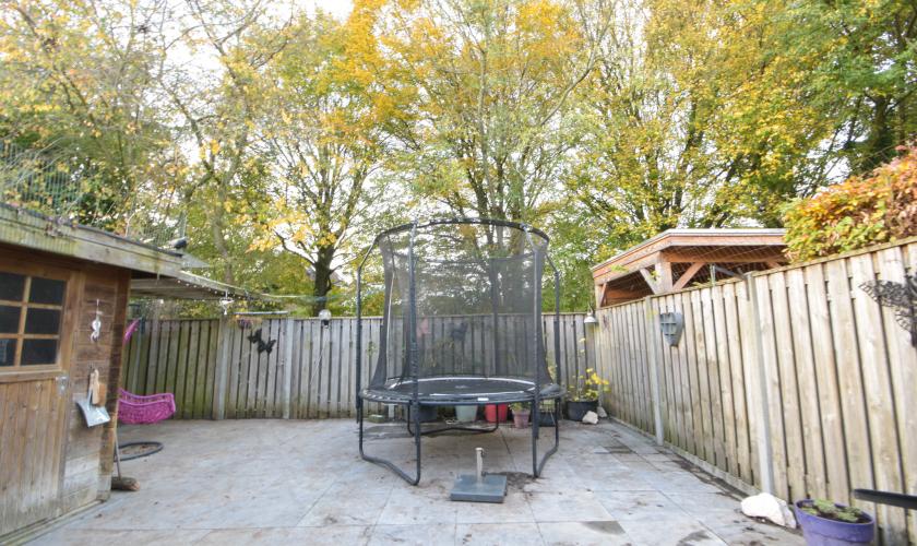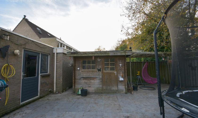 Tuin: Achtertuin gelegen op het noordwesten met overkapping, houten schuur/berging en extra fietsoverkapping.