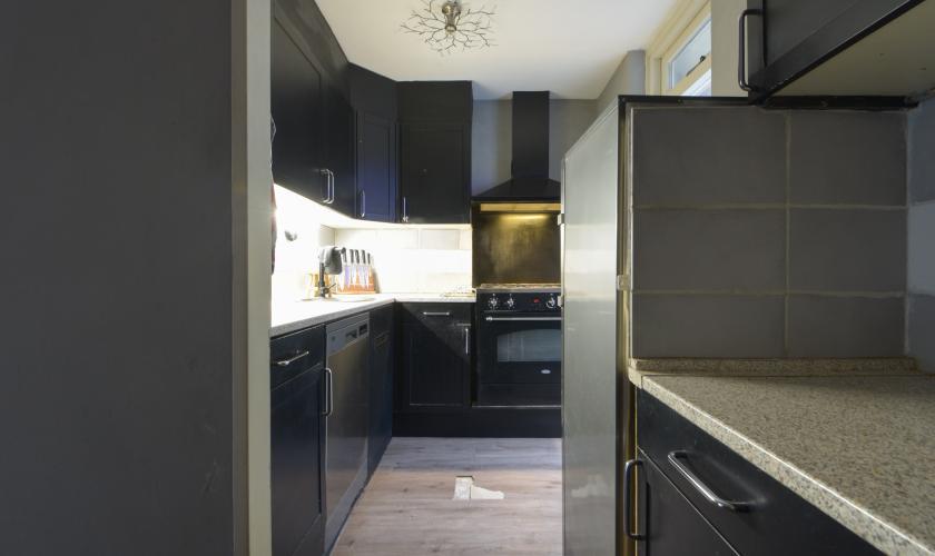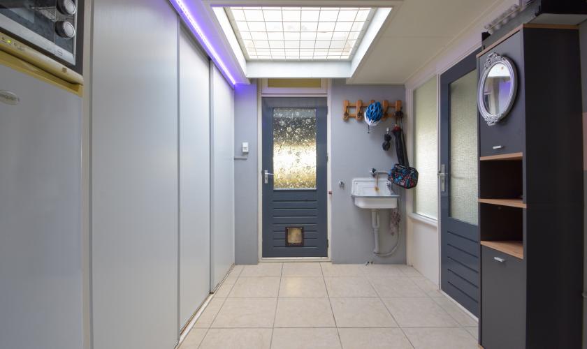 Begane grond: hal/entree, toilet, trapopgang, L-vormige woonkamer, openslaande deuren naar achtertuin, keuken, bijkeuken met lichtkoepel, toegang naar schuur en achterstraat.