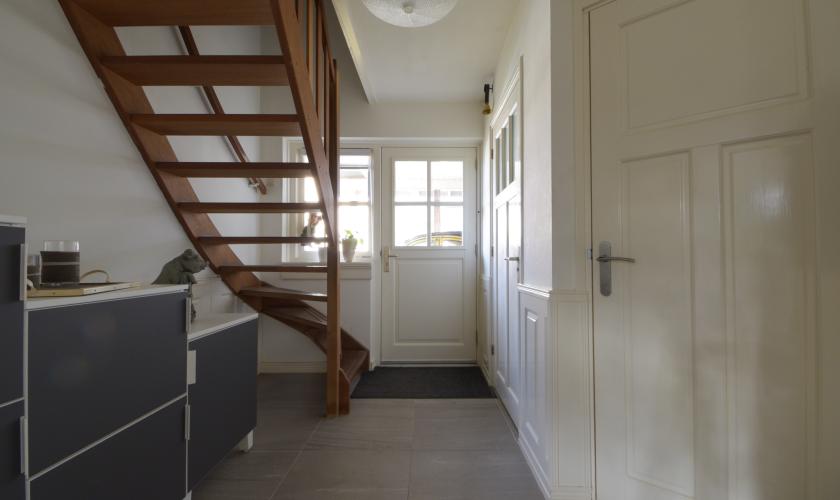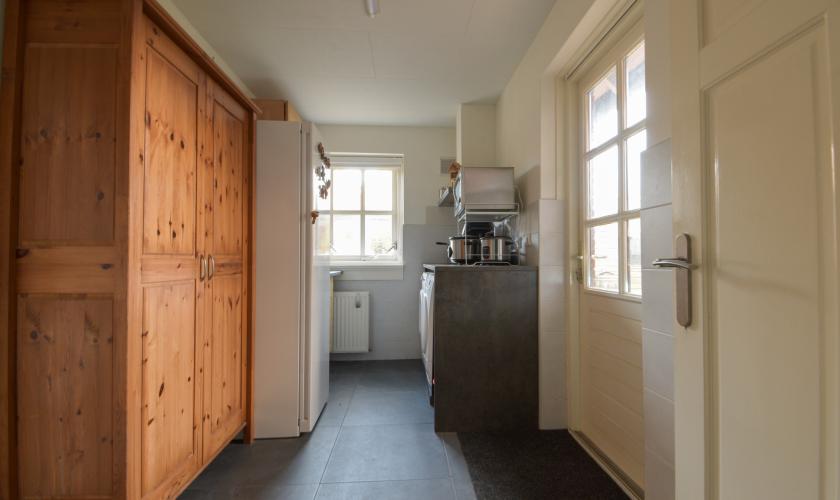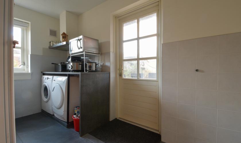Entree met trapopgang, toilet en meterkast. De straatgerichte woonkamer is voorzien van een massief eiken parketvloer. De keuken in U-opstelling beschikt over een 6-pits fornuis met oven, vaatwasser, schouwafzuigkap en koelkast. Via openslaande deuren is er toegang tot de achtertuin en het terras. Aangrenzend bevindt zich de bijkeuken met aanrecht en aansluitingen voor wasmachine en droger, met doorgang naar de garage. De garage is voorzien van een plavuizenvloer en hardhouten openslaande deuren. Op eigen terrein is parkeergelegenheid voor meerdere auto’s dankzij de carport en ruime oprit (circa drie auto’s).