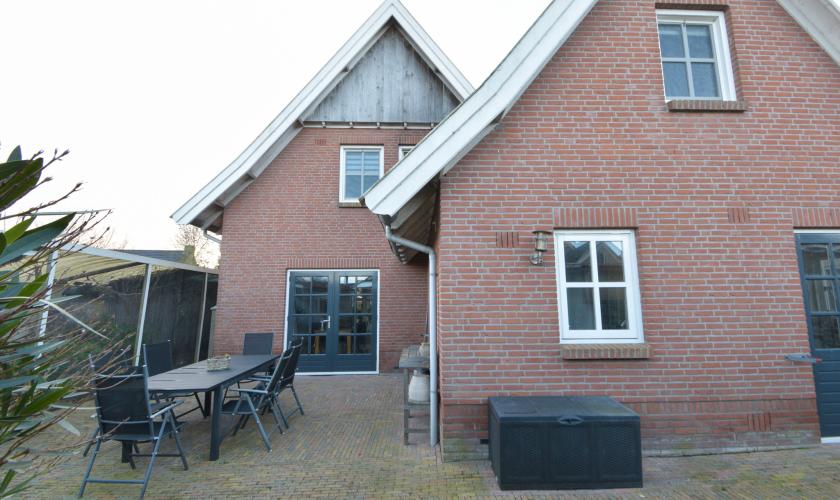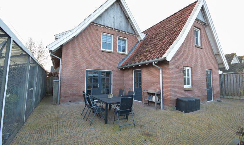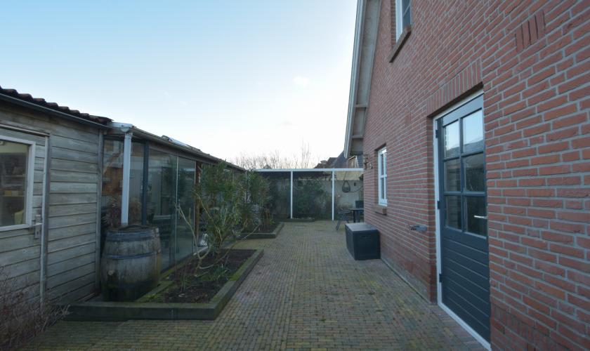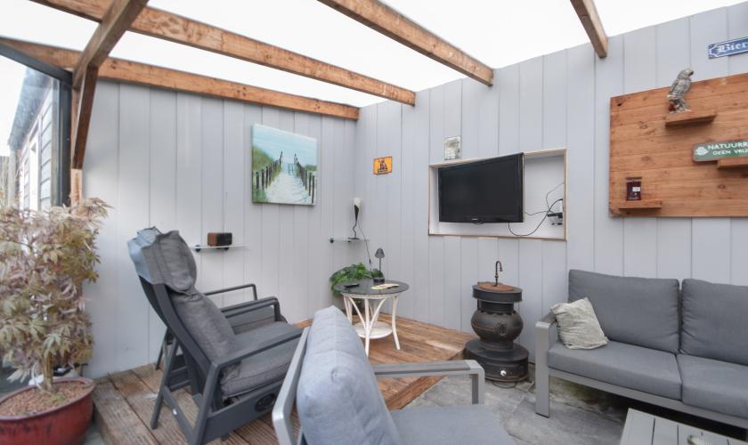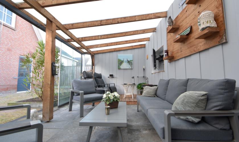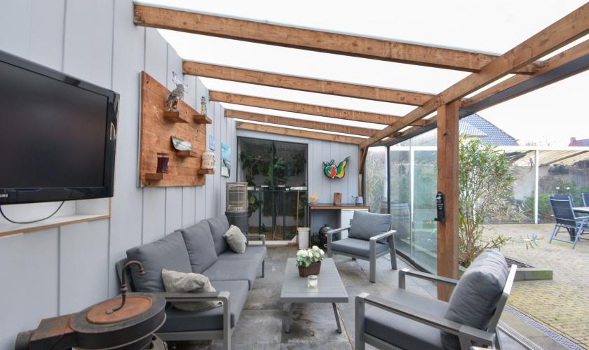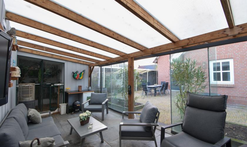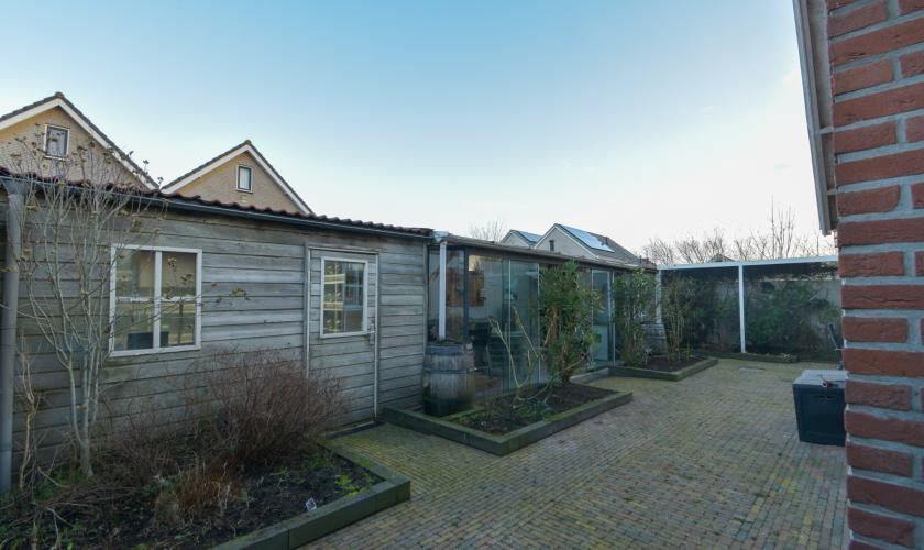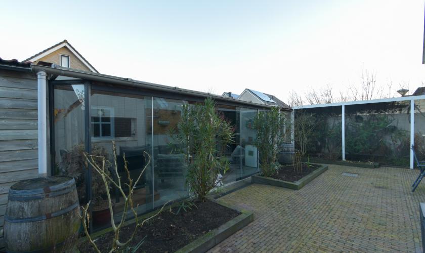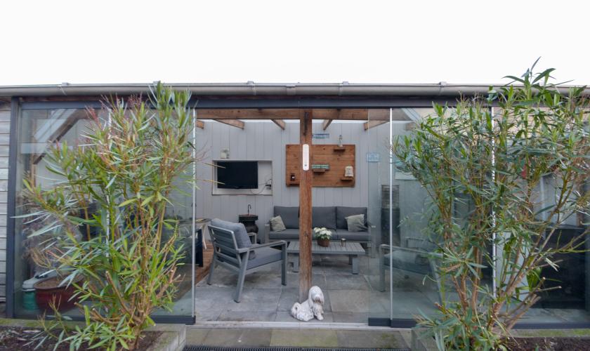 In de achtertuin bevinden zich een ruime schuur/berging en een sfeervolle, loungeachtige overkapping met tv-aansluiting. Deze overkapping kan met zes deuren volledig winddicht worden afgesloten en biedt toegang tot een binnenvolière.