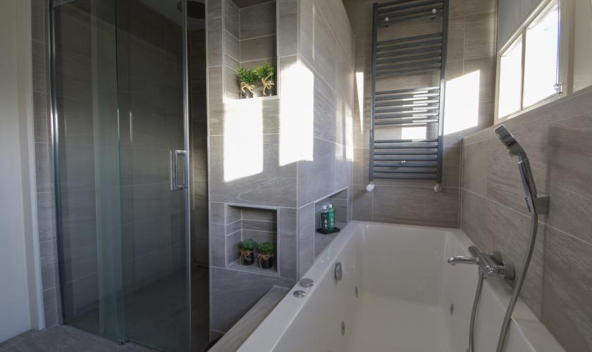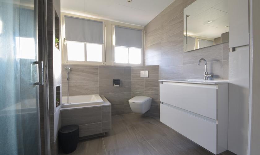 Ruime overloop, drie royale slaapkamers en een complete badkamer met grootformaat inloopdouche (120 x 120 cm), duoligbad, hangtoilet, wastafelmeubel en designradiator. Vanaf de overloop is tevens toegang tot de royale ruimte boven de garage (circa 11 x 4 meter), momenteel ingericht als vierde slaapkamer, met mogelijkheid tot het realiseren van een extra kamer.